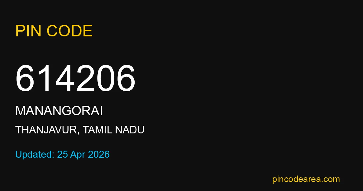 614206 PIN Code is assigned to Manangorai Post Office located in Thanjavur district of Tamil Nadu. It helps in identifying the exact delivery area.