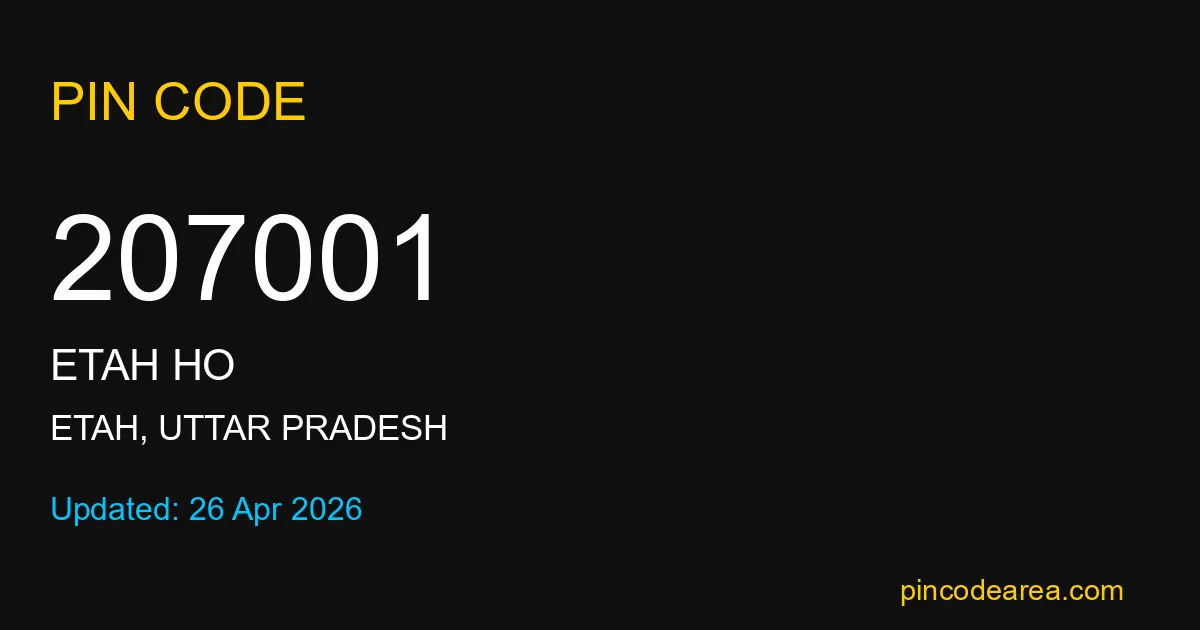 207001 PIN Code is assigned to Etah HO Post Office located in Etah district of Uttar Pradesh. It helps identify the exact delivery area for postal and courier services.