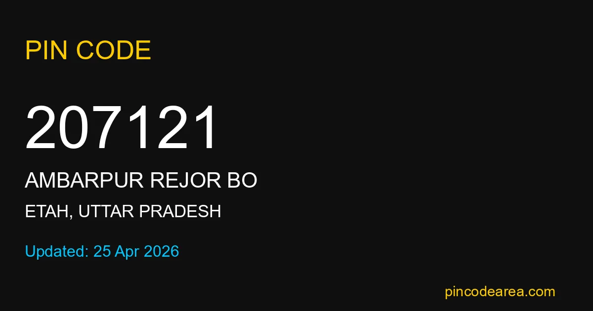 207121 PIN Code belongs to Ambarpur Rejor BO Post Office in Etah district of Uttar Pradesh, India. This area mainly includes local residential and rural regions where India Post ensures timely mail and parcel delivery services.