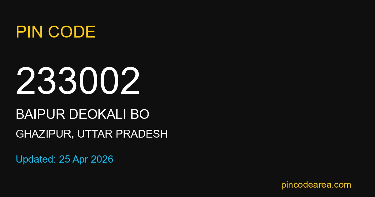233002 PIN Code is assigned to Baipur Deokali BO Post Office located in Ghazipur district of Uttar Pradesh. It helps in identifying the exact delivery area.