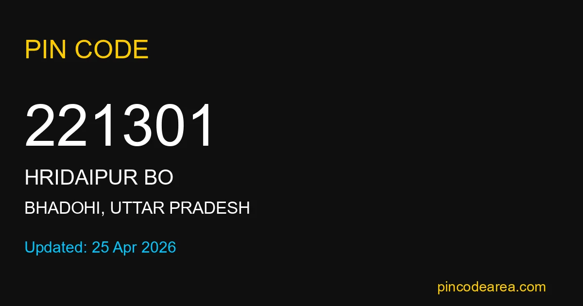 221301 PIN Code is assigned to Hridaipur BO Post Office located in Bhadohi district of Uttar Pradesh. It helps in identifying the exact delivery area.