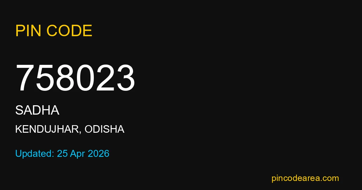 758023 PIN Code belongs to Sadha Post Office in Kendujhar district of Odisha, India. This area mainly includes local residential and rural regions where India Post ensures timely mail and parcel delivery services.