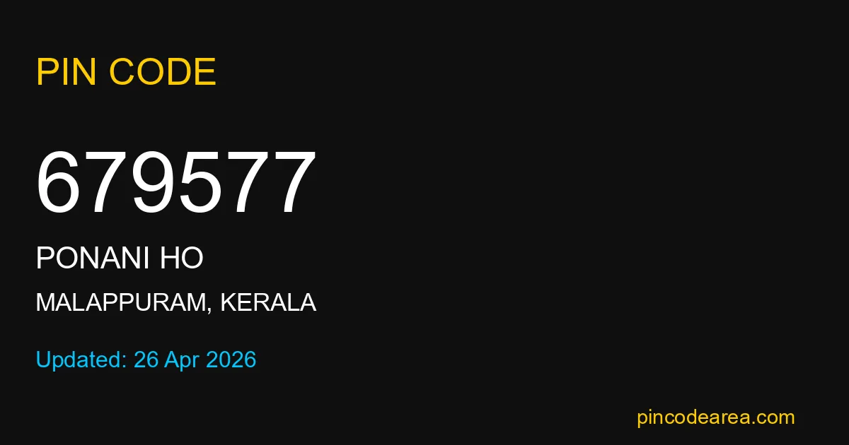 679577 PIN Code belongs to Ponani HO Post Office in Malappuram district of Kerala, India. This area mainly includes local residential and rural regions where India Post ensures timely mail and parcel delivery services.