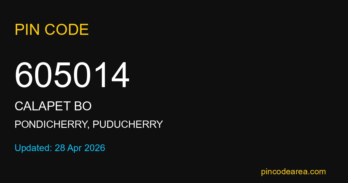 605014 PIN Code is assigned to Calapet BO Post Office located in Pondicherry district of Puducherry. It helps identify the exact delivery area for postal and courier services.