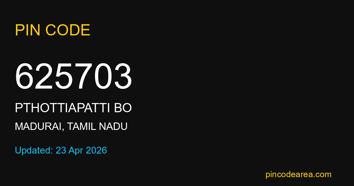 625703 PIN Code is assigned to PThottiapatti BO Post Office located in Madurai district of Tamil Nadu. It helps in identifying the exact delivery area.