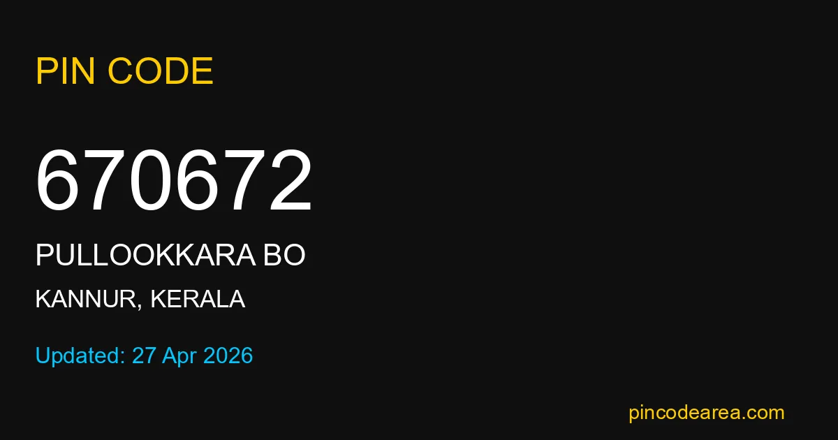 670672 PIN Code is assigned to Pullookkara BO Post Office located in Kannur district of Kerala. It helps identify the exact delivery area for postal and courier services.
