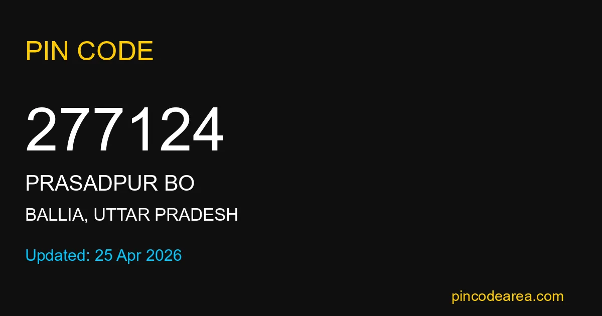 277124 PIN Code is assigned to Prasadpur BO Post Office located in Ballia district of Uttar Pradesh. It helps in identifying the exact delivery area.