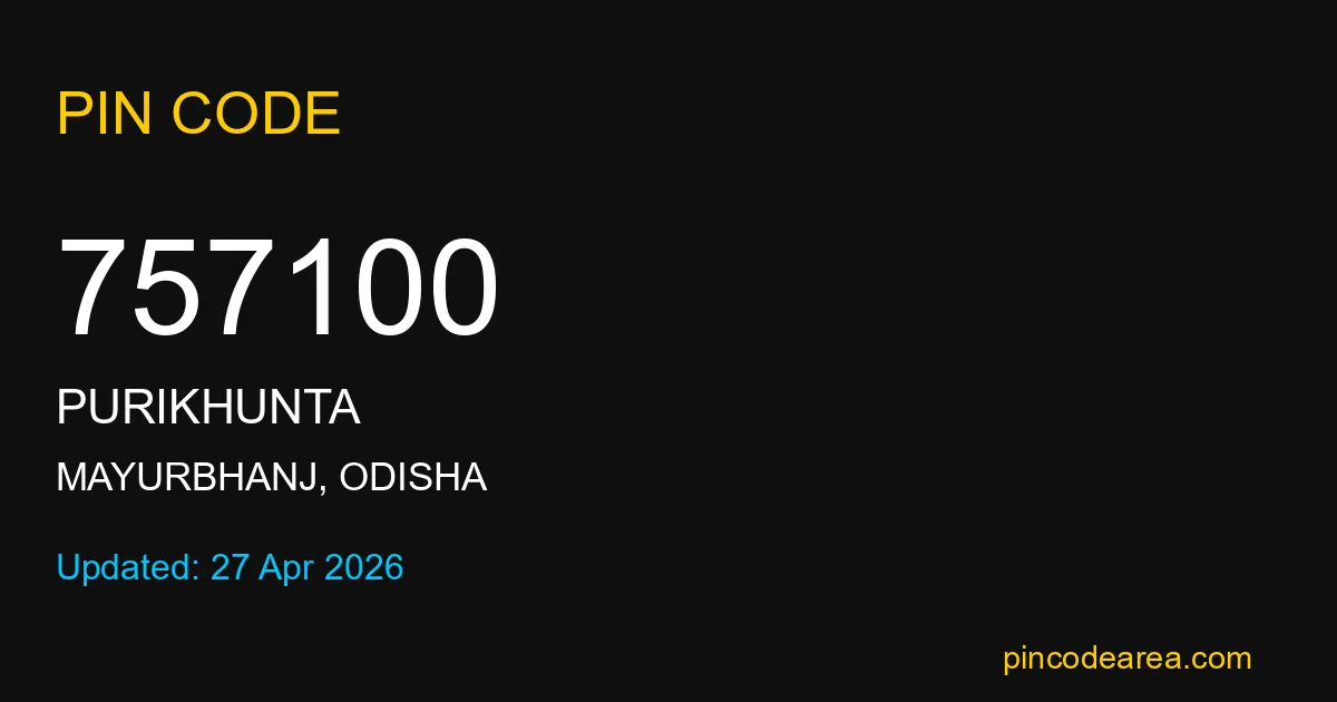 757100 PIN Code is assigned to Purikhunta Post Office located in Mayurbhanj district of Odisha. It helps identify the exact delivery area for postal and courier services.