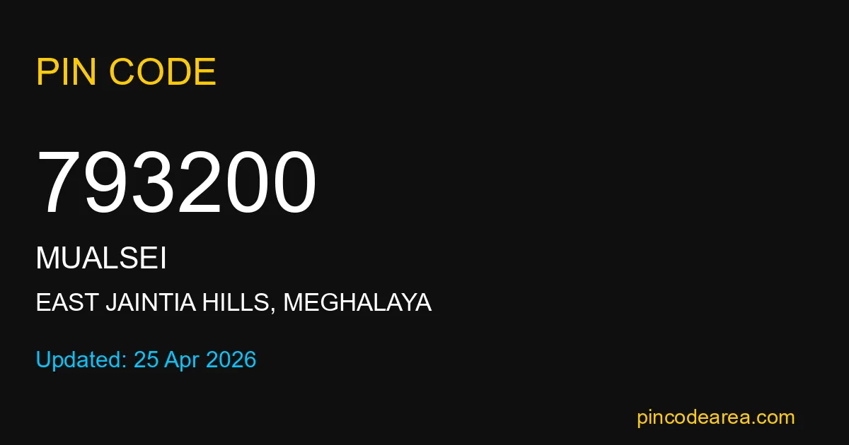 793200 PIN Code belongs to Mualsei Post Office in East Jaintia Hills district of Meghalaya, India. This area mainly includes local residential and rural regions where India Post ensures timely mail and parcel delivery services.