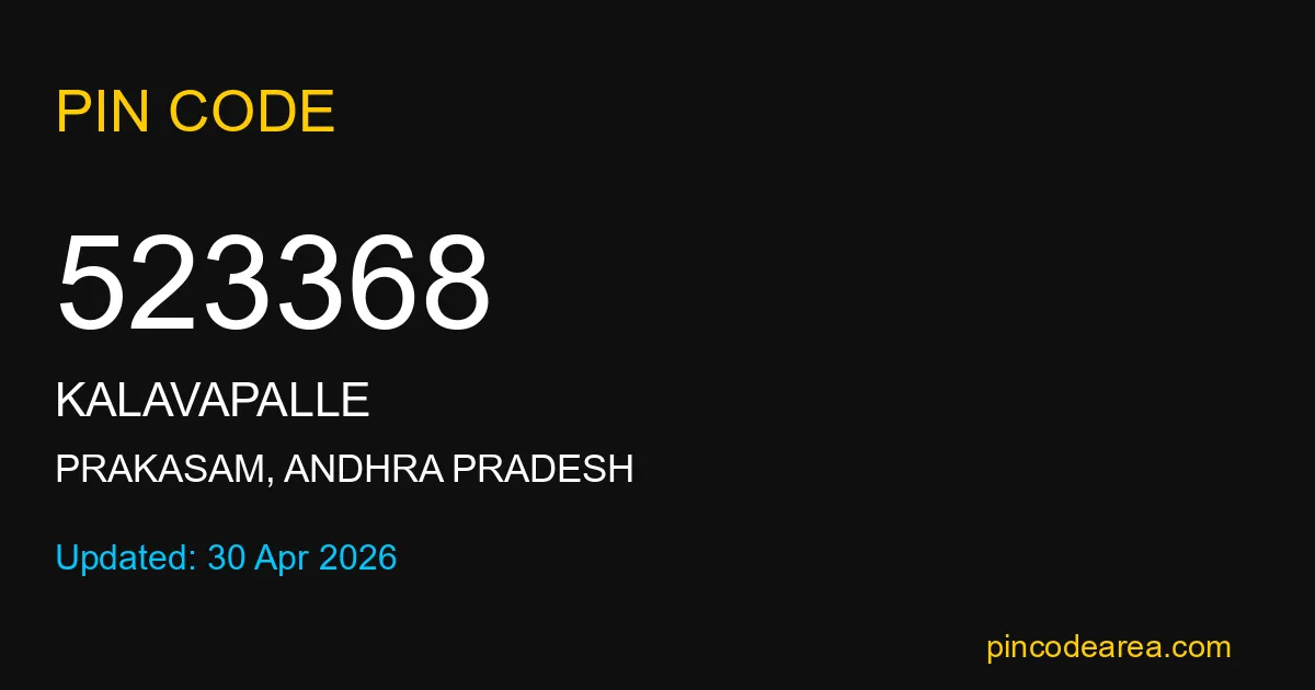 523368 PIN Code is assigned to Kalavapalle Post Office located in Prakasam district of Andhra Pradesh. It helps identify the exact delivery area for postal and courier services.