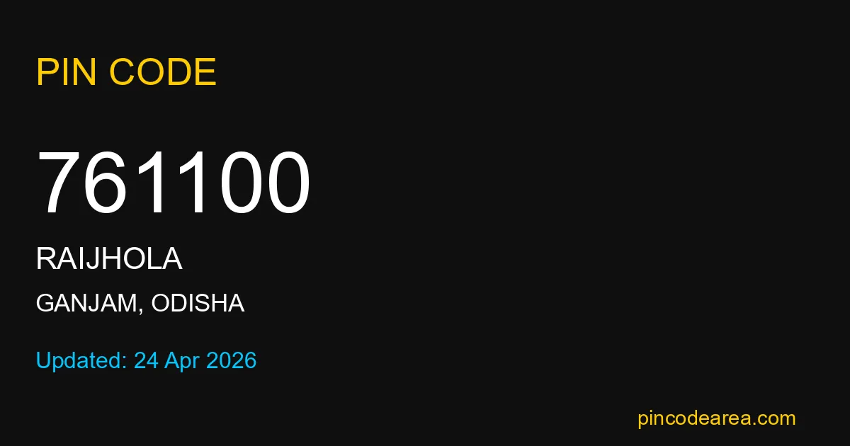 761100 PIN Code is assigned to Raijhola Post Office located in Ganjam district of Odisha. It helps in identifying the exact delivery area.