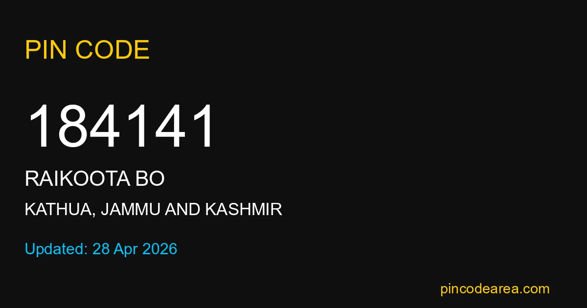 184141 PIN Code is assigned to Raikoota BO Post Office located in Kathua district of Jammu And Kashmir. It helps identify the exact delivery area for postal and courier services.