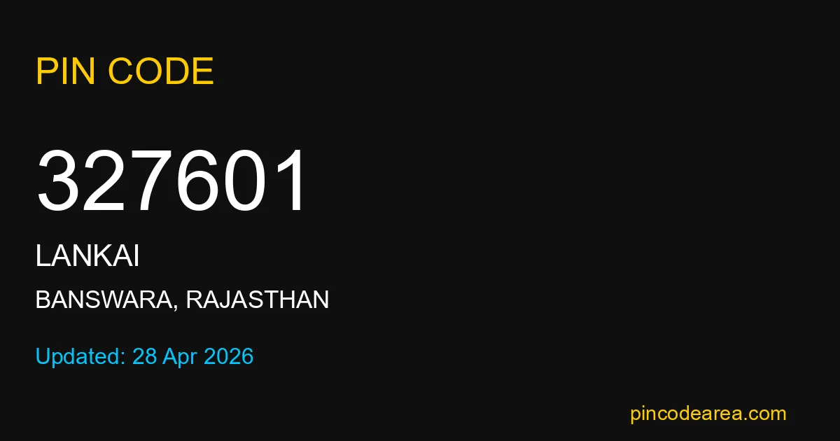 327601 PIN Code is assigned to Lankai Post Office located in Banswara district of Rajasthan. It helps identify the exact delivery area for postal and courier services.