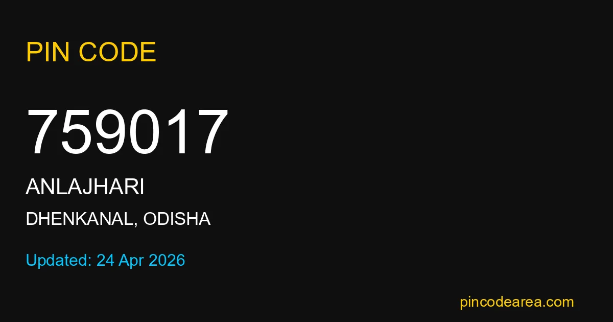 759017 PIN Code is assigned to Anlajhari Post Office located in Dhenkanal district of Odisha. It helps in identifying the exact delivery area.