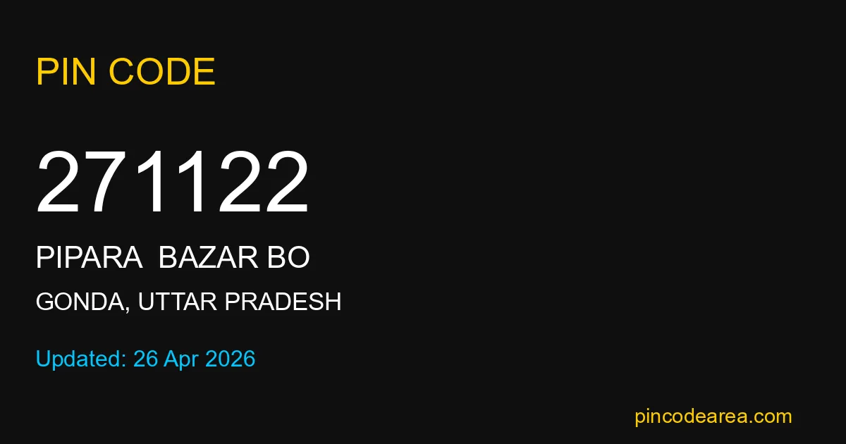 271122 PIN Code is assigned to Pipara Bazar BO Post Office located in Gonda district of Uttar Pradesh. It helps in identifying the exact delivery area.