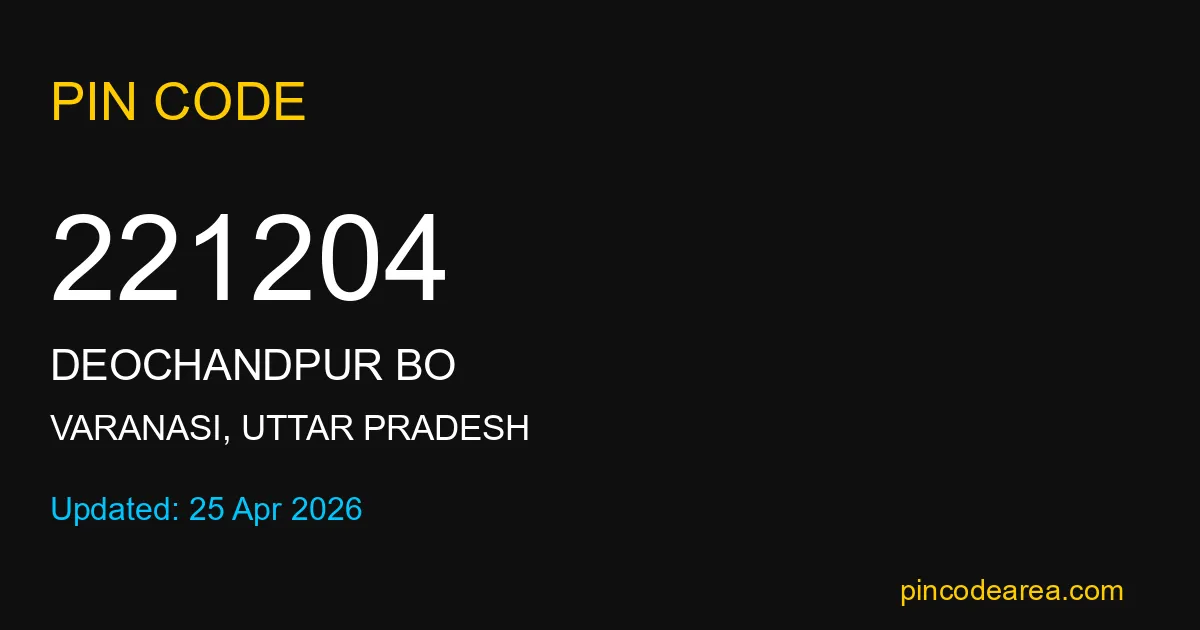 221204 PIN Code belongs to Deochandpur BO Post Office in Varanasi district of Uttar Pradesh, India. This area mainly includes local residential and rural regions where India Post ensures timely mail and parcel delivery services.
