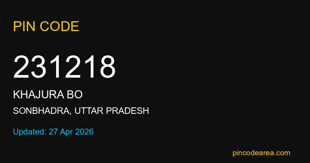 231218 PIN Code is assigned to Khajura BO Post Office located in Sonbhadra district of Uttar Pradesh. It helps identify the exact delivery area for postal and courier services.