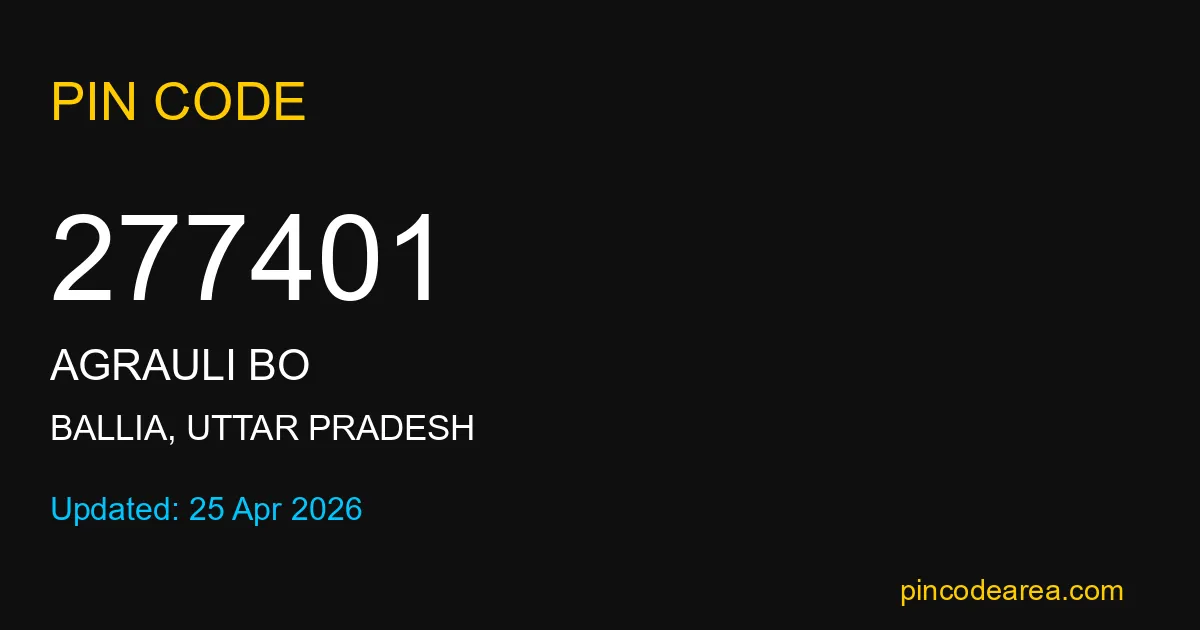 277401 PIN Code is assigned to Agrauli BO Post Office located in Ballia district of Uttar Pradesh. It helps in identifying the exact delivery area.