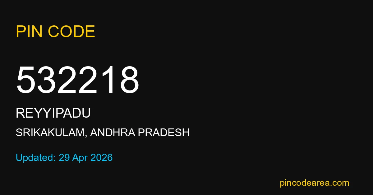 532218 PIN Code is assigned to Reyyipadu Post Office located in Srikakulam district of Andhra Pradesh. It helps identify the exact delivery area for postal and courier services.