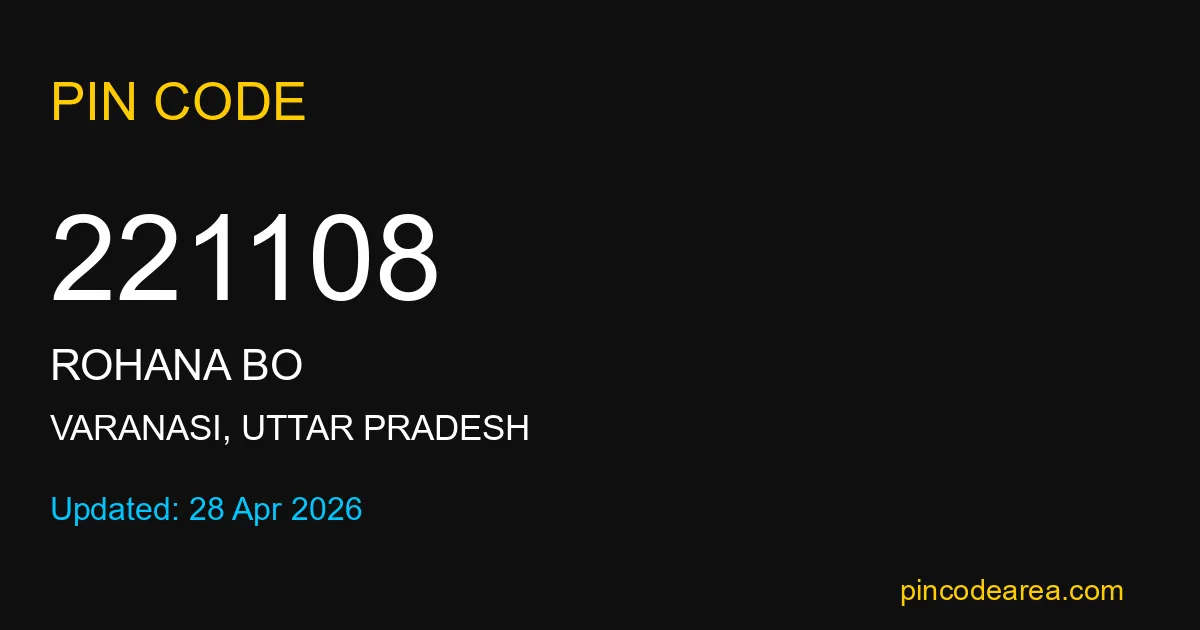 221108 PIN Code is assigned to Rohana BO Post Office located in Varanasi district of Uttar Pradesh. It helps identify the exact delivery area for postal and courier services.