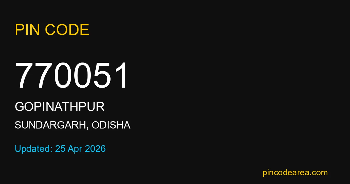 770051 PIN Code is assigned to Gopinathpur Post Office located in Sundargarh district of Odisha. It helps in identifying the exact delivery area.