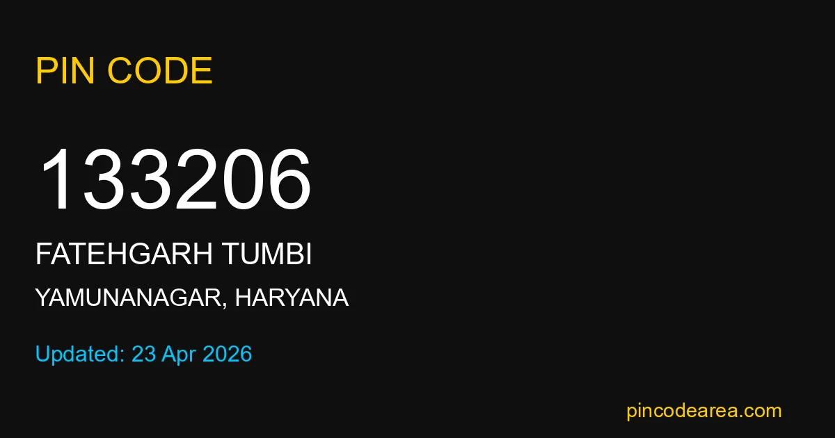 133206 PIN Code is assigned to Fatehgarh Tumbi Post Office located in Yamunanagar district of Haryana. It helps in identifying the exact delivery area.