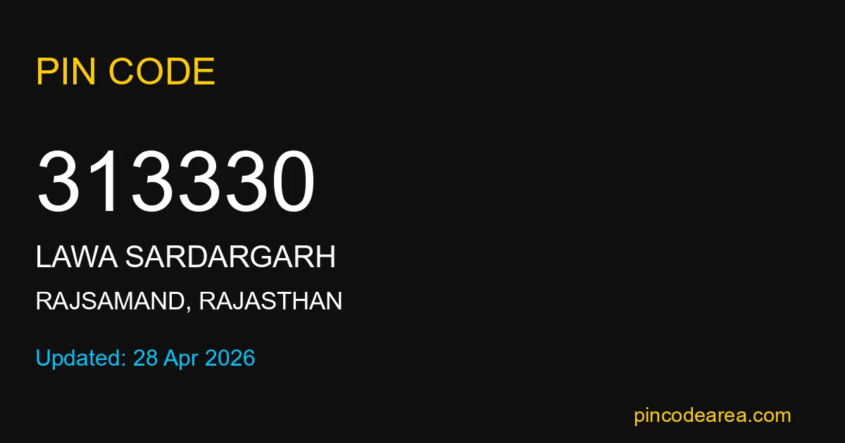 313330 PIN Code is assigned to Lawa Sardargarh Post Office located in Rajsamand district of Rajasthan. It helps identify the exact delivery area for postal and courier services.