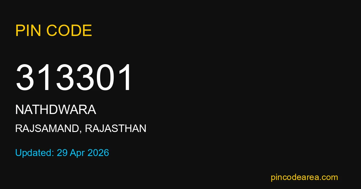 313301 PIN Code is assigned to Nathdwara Post Office located in Rajsamand district of Rajasthan. It helps identify the exact delivery area for postal and courier services.