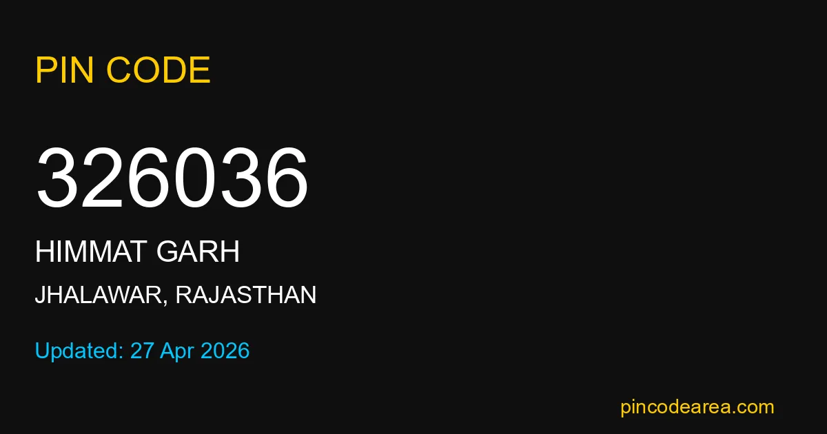 326036 PIN Code is assigned to Himmat Garh Post Office located in Jhalawar district of Rajasthan. It helps identify the exact delivery area for postal and courier services.