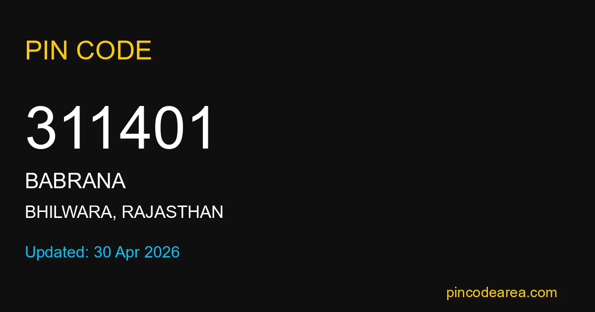 311401 PIN Code is assigned to Babrana Post Office located in Bhilwara district of Rajasthan. It helps identify the exact delivery area for postal and courier services.