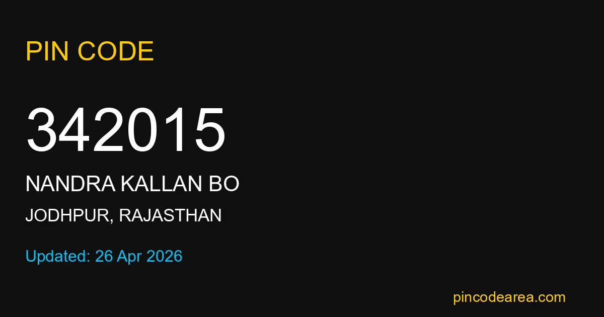 342015 PIN Code belongs to Nandra Kallan BO Post Office in Jodhpur district of Rajasthan, India. This area mainly includes local residential and rural regions where India Post ensures timely mail and parcel delivery services.