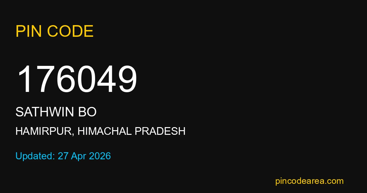 176049 PIN Code is assigned to Sathwin BO Post Office located in Hamirpur district of Himachal Pradesh. It helps identify the exact delivery area for postal and courier services.