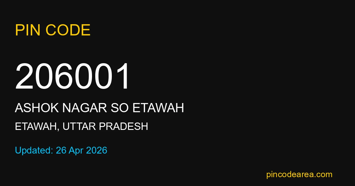 If you are searching for accurate location details, 206001 helps identify the exact postal region of Ashok Nagar SO Etawah in Uttar Pradesh.