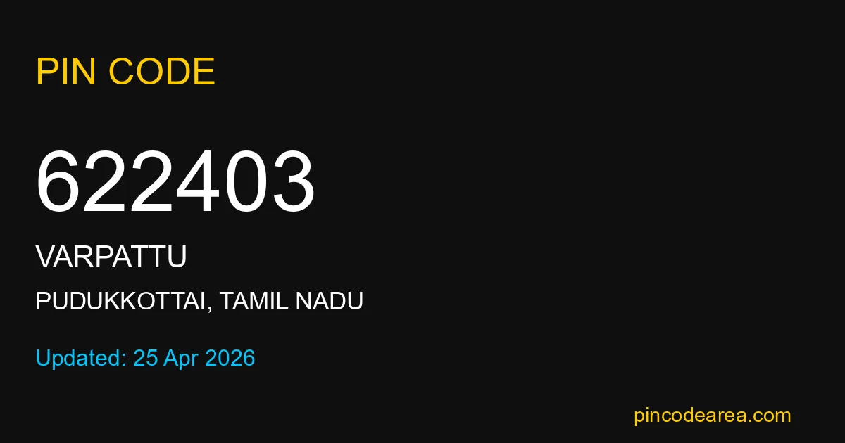 622403 PIN Code is assigned to Varpattu Post Office located in Pudukkottai district of Tamil Nadu. It helps in identifying the exact delivery area.