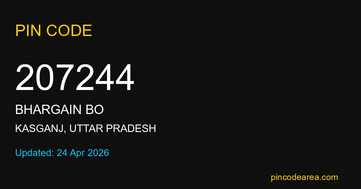 207244 PIN Code is assigned to Bhargain BO Post Office located in Kasganj district of Uttar Pradesh. It helps in identifying the exact delivery area.