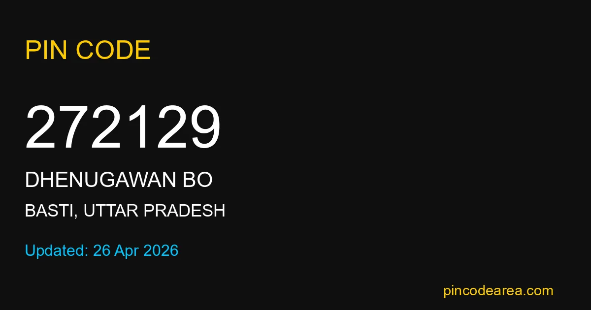 272129 PIN Code is assigned to Dhenugawan BO Post Office located in Basti district of Uttar Pradesh. It helps identify the exact delivery area for postal and courier services.