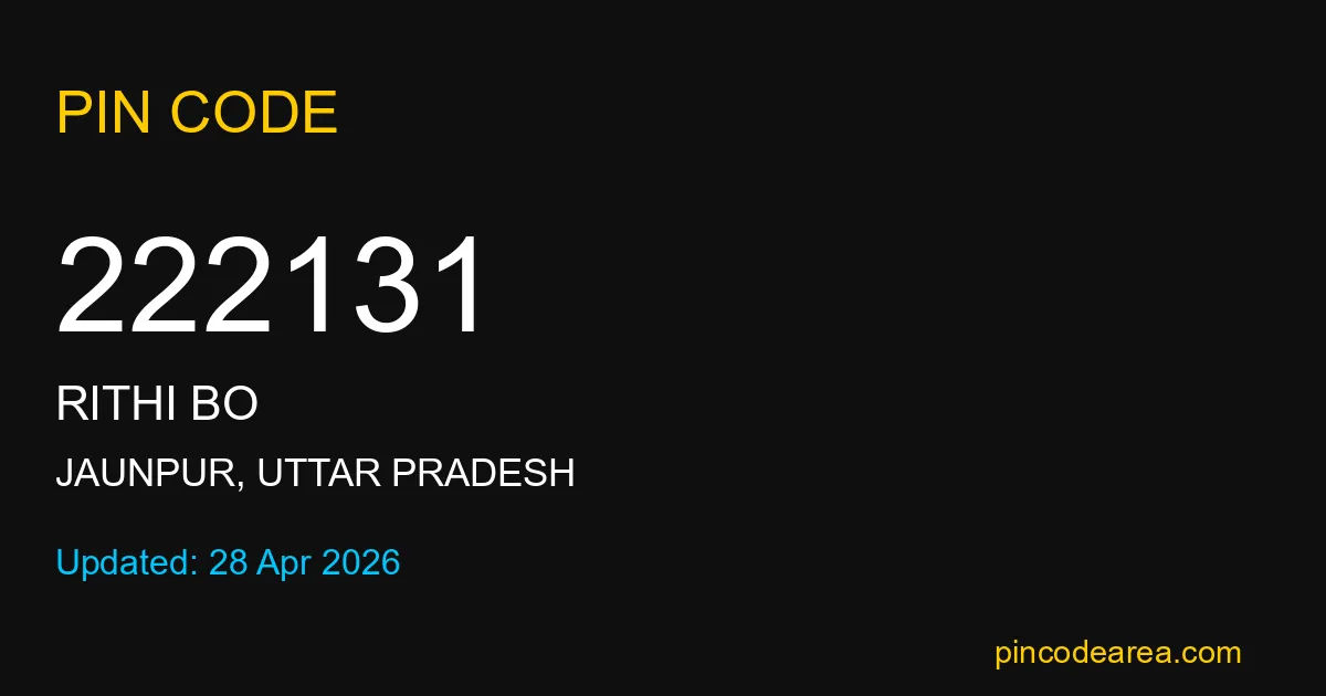 222131 PIN Code belongs to Rithi BO Post Office in Jaunpur district of Uttar Pradesh, India. This area mainly includes local residential and rural regions where India Post ensures timely mail and parcel delivery services.