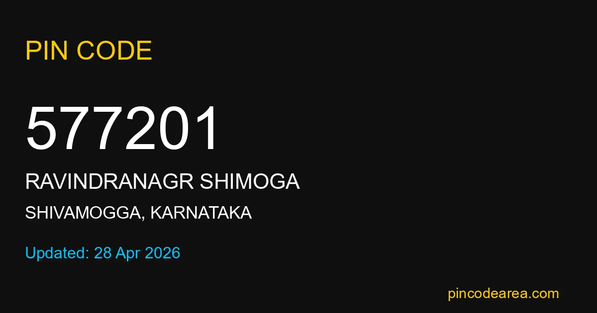 577201 PIN Code is assigned to Ravindranagr shimoga Post Office located in Shivamogga district of Karnataka. It helps identify the exact delivery area for postal and courier services.