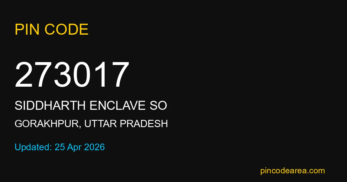 273017 PIN Code belongs to Siddharth Enclave SO Post Office in Gorakhpur district of Uttar Pradesh, India. This area mainly includes local residential and rural regions where India Post ensures timely mail and parcel delivery services.