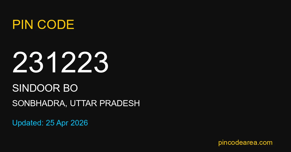 231223 PIN Code belongs to Sindoor BO Post Office in Sonbhadra district of Uttar Pradesh, India. This area mainly includes local residential and rural regions where India Post ensures timely mail and parcel delivery services.