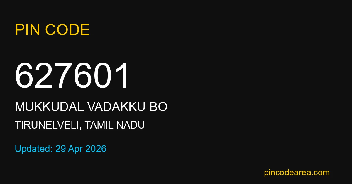 627601 PIN Code is assigned to Mukkudal Vadakku BO Post Office located in Tirunelveli district of Tamil Nadu. It helps identify the exact delivery area for postal and courier services.