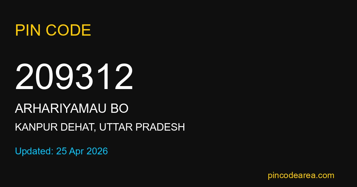 209312 PIN Code is assigned to Arhariyamau BO Post Office located in Kanpur Dehat district of Uttar Pradesh. It helps in identifying the exact delivery area.