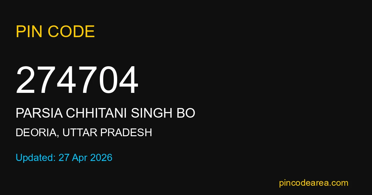274704 PIN Code belongs to Parsia Chhitani Singh BO Post Office in Deoria district of Uttar Pradesh, India. This area mainly includes local residential and rural regions where India Post ensures timely mail and parcel delivery services.