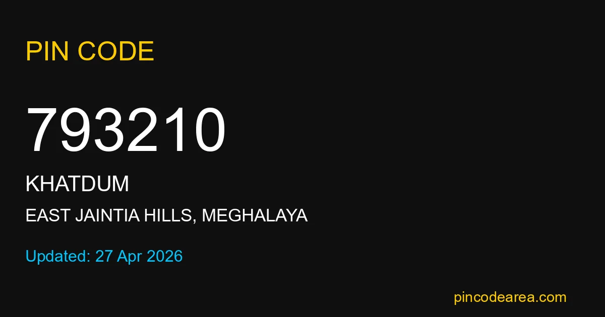 793210 PIN Code belongs to Khatdum Post Office in East Jaintia Hills district of Meghalaya, India. This area mainly includes local residential and rural regions where India Post ensures timely mail and parcel delivery services.