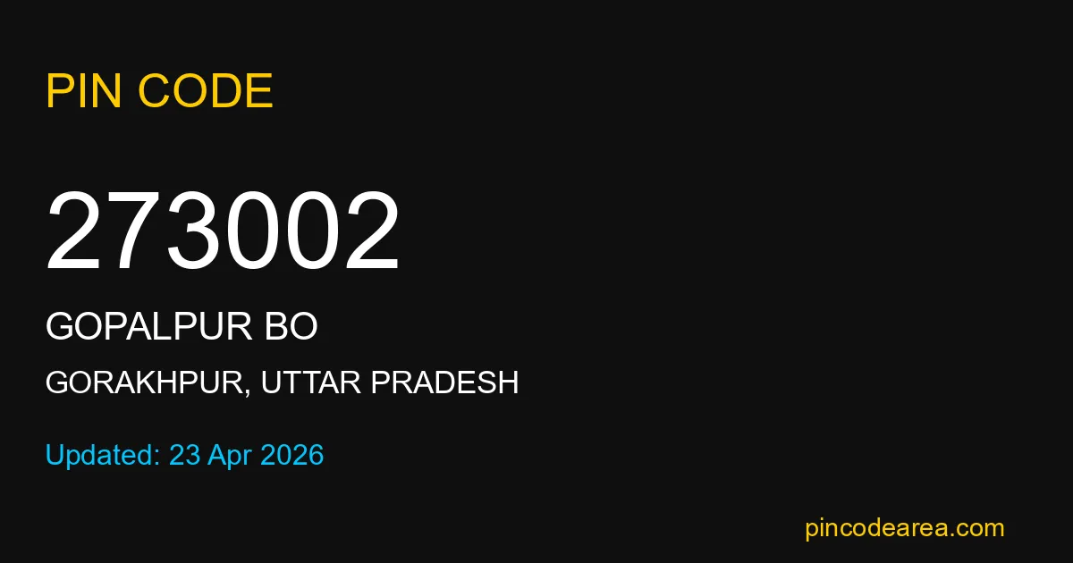 273002 PIN Code is assigned to Gopalpur BO Post Office located in Gorakhpur district of Uttar Pradesh. It helps in identifying the exact delivery area.
