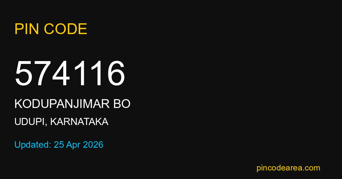 574116 PIN Code is assigned to Kodupanjimar BO Post Office located in Udupi district of Karnataka. It helps in identifying the exact delivery area.