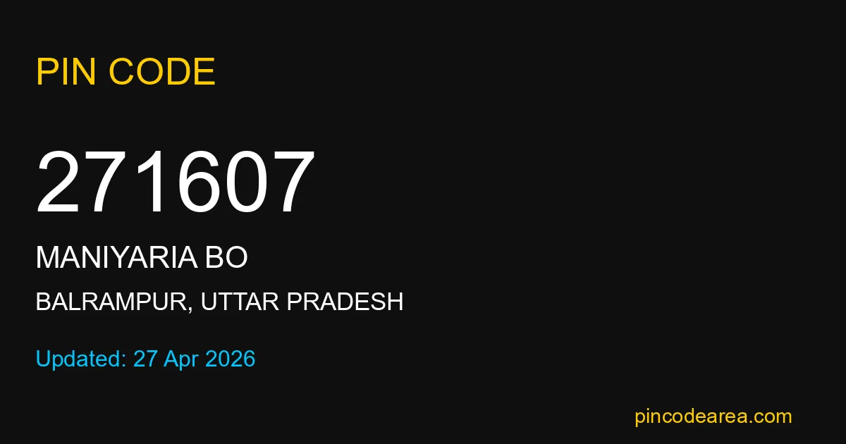 271607 PIN Code is assigned to Maniyaria BO Post Office located in Balrampur district of Uttar Pradesh. It helps identify the exact delivery area for postal and courier services.