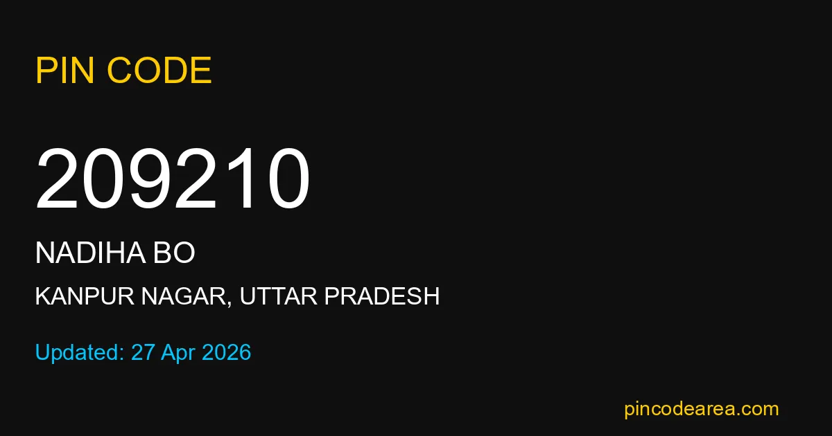 209210 PIN Code is assigned to Nadiha BO Post Office located in Kanpur Nagar district of Uttar Pradesh. It helps identify the exact delivery area for postal and courier services.