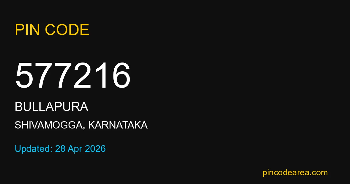 577216 PIN Code is assigned to Bullapura Post Office located in Shivamogga district of Karnataka. It helps identify the exact delivery area for postal and courier services.