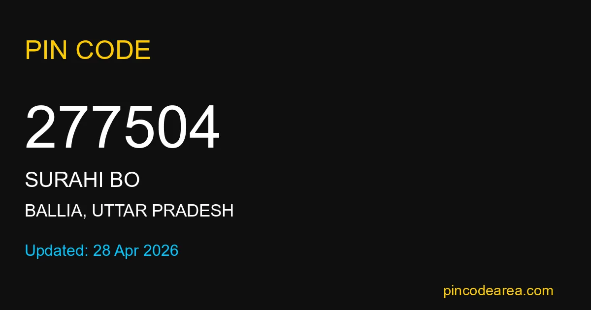 277504 PIN Code is assigned to Surahi BO Post Office located in Ballia district of Uttar Pradesh. It helps identify the exact delivery area for postal and courier services.
